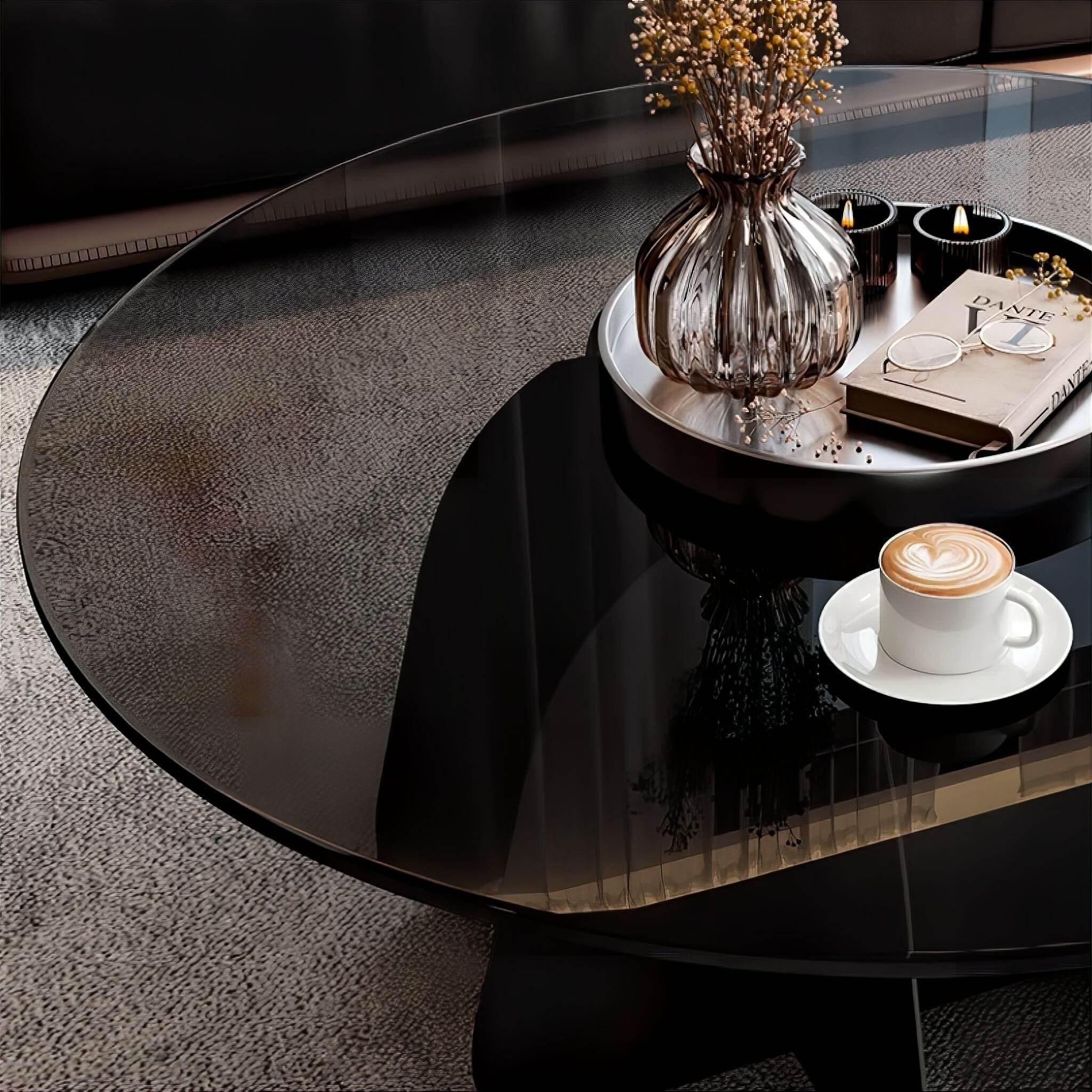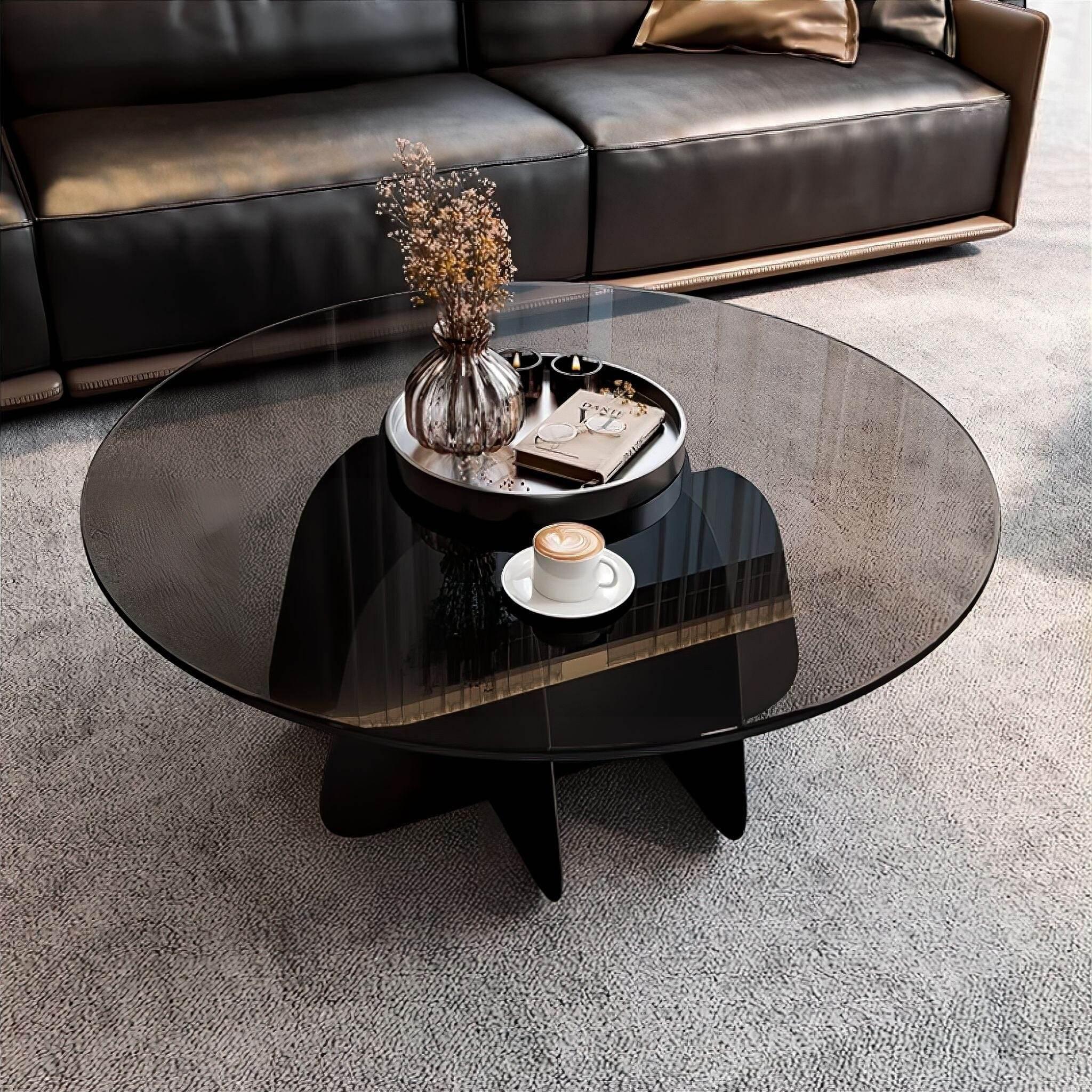 The circular glass top not only showcases the exquisite design of the base but also provides a sleek surface for your coffee, books, and decorative items. With exceptional craftsmanship and high-quality materials, this coffee table serves as a versatile centerpiece, effortlessly enhancing the sophistication of your space. Transform your living area with this chic and functional addition to your home.