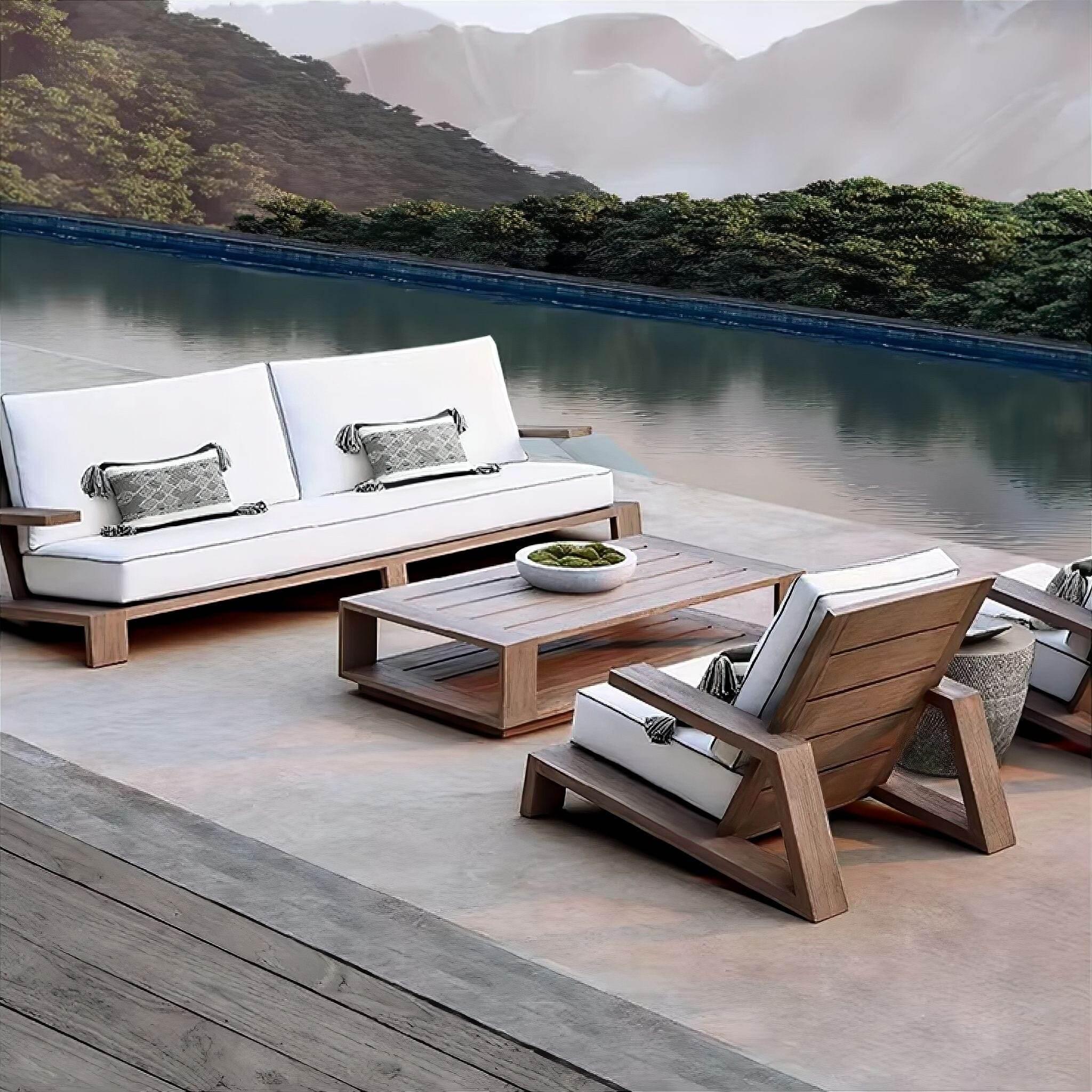 The Camille Outdoor Furniture Collection features a rich brown wood finish that beautifully balances elegance and comfort in your outdoor living space. This versatile set is ideal for lounging and entertaining, comprising a coffee table, single sofa, double sofa, triple sofa, and an accompanying single pedestal.