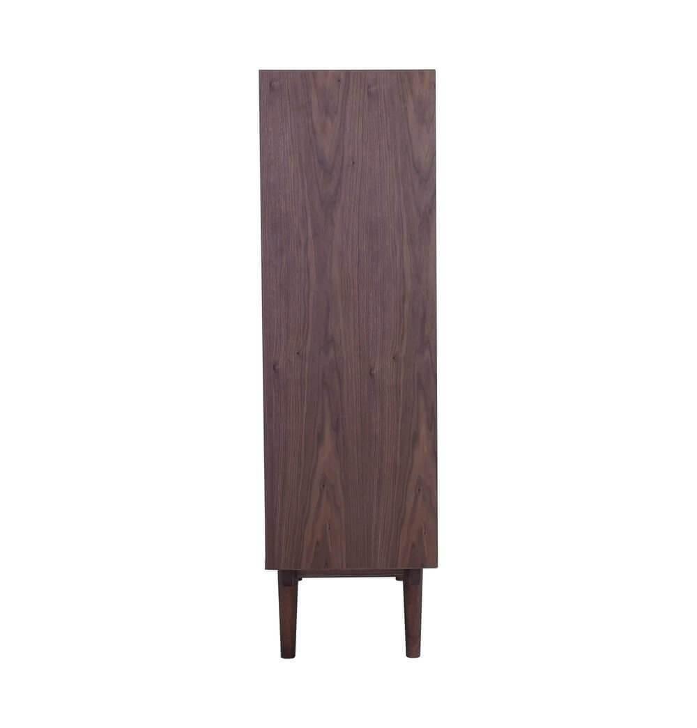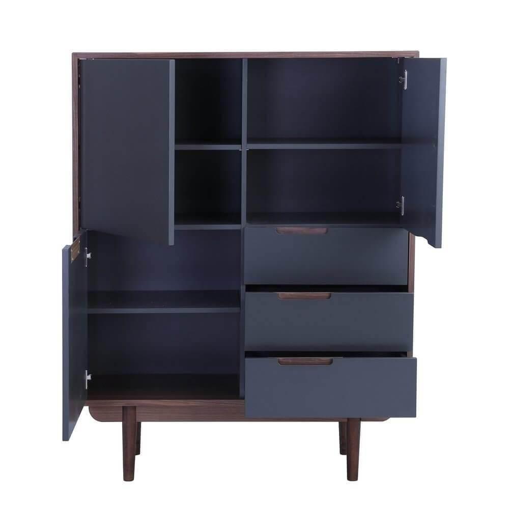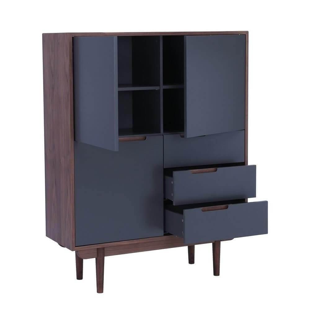 Verwandeln Sie Ihren Wohnraum mit dem Nakula Tall Sideboard, einem wunderschön gefertigten Aufbewahrungsschrank, der moderne, Mid-Century- und skandinavische Designeinflüsse vereint. Hergestellt aus robustem Walnussfurnier und in edlem Rotgussgrau gehalten, bietet dieses Möbelstück Stil und Funktionalität zugleich. Die massiven Walnussbeine stützen den Schrank und verleihen seiner schlanken Form ein warmes, einladendes Element.
