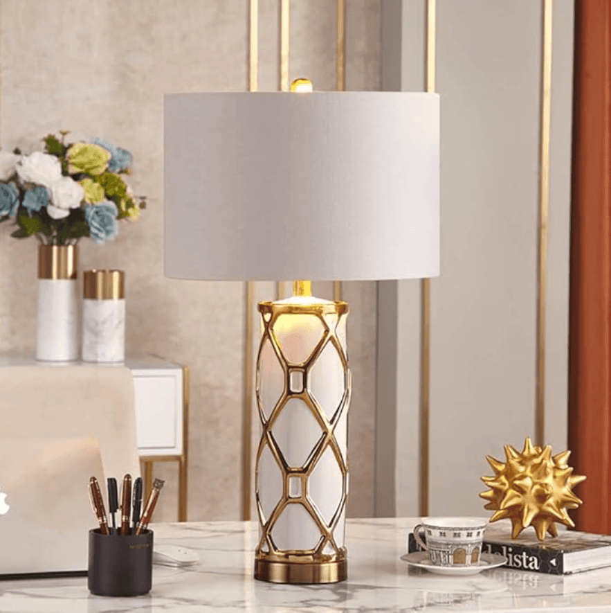 Verwandeln Sie Ihren Raum mit der bezaubernden Mystic Chamber Light, einer wunderschön gestalteten Lampe, die Ihrer Wohnkultur einen Hauch von Eleganz und Faszination verleiht. Die Lampe verfügt über einen eleganten weißen Sockel, der durch ein luxuriöses, verwobenes Goldgitterdesign elegant ergänzt wird und die Essenz verborgener Kammern und den Reiz unerzählter Geheimnisse einfängt.