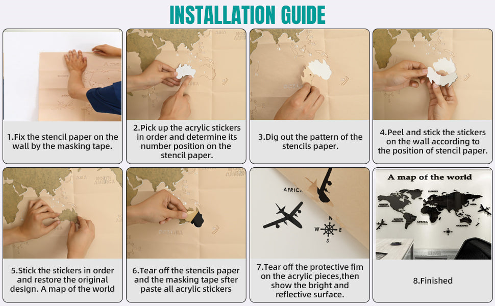 Verwandeln Sie Ihren Raum mit dieser Weltkarten-Wandkunst. Sie besteht aus leuchtenden, reflektierenden Acrylblöcken und wirkt dadurch realistischer als herkömmliche Vinyl-Wandaufkleber. Die Anbringung ist kinderleicht: Einfach die Form ausrichten, die Rückseite abziehen und aufkleben, um das beeindruckende Design zu enthüllen.