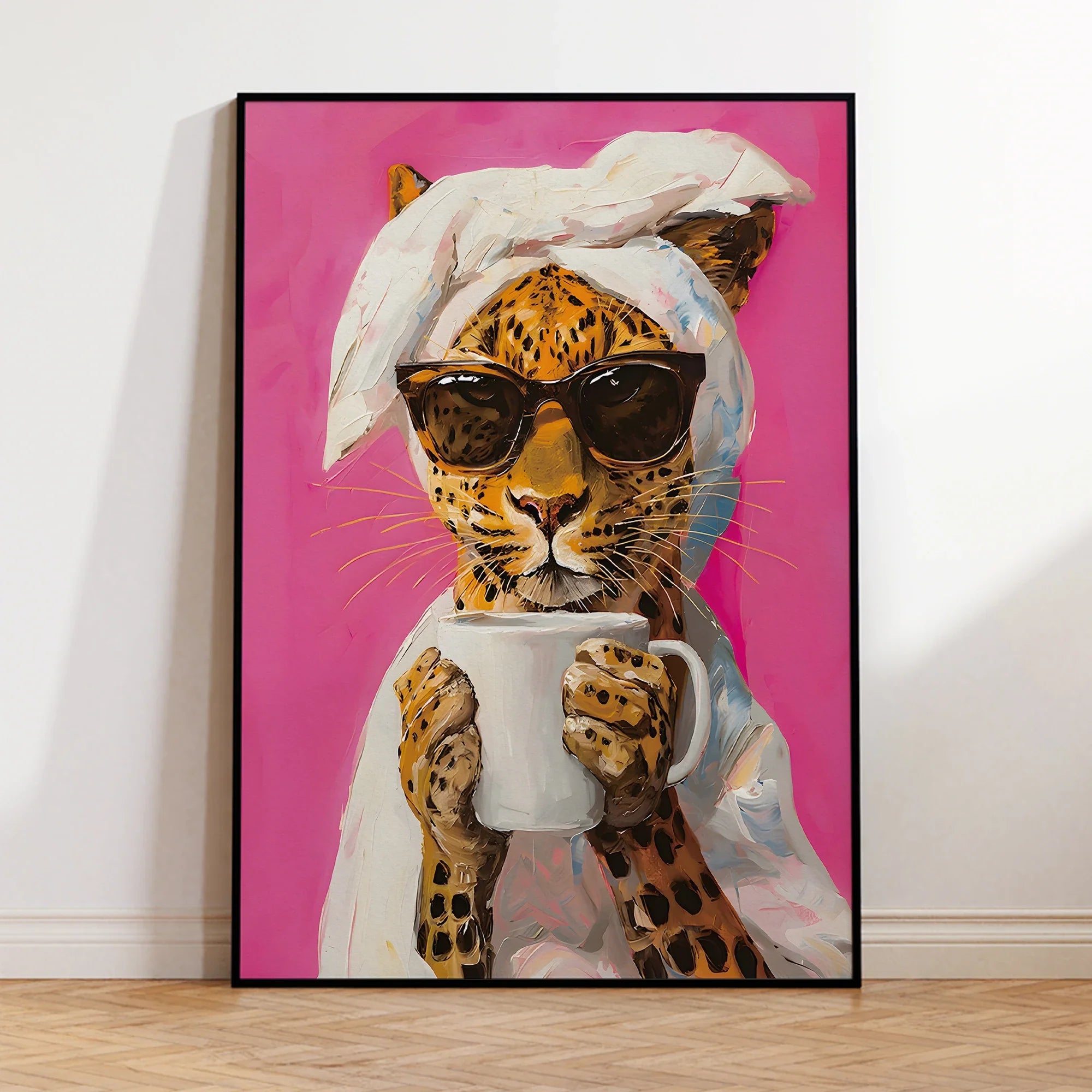 Design : Présente une illustration dynamique et originale d'un léopard élégant sirotant son café du matin, dégageant charme et décontraction.