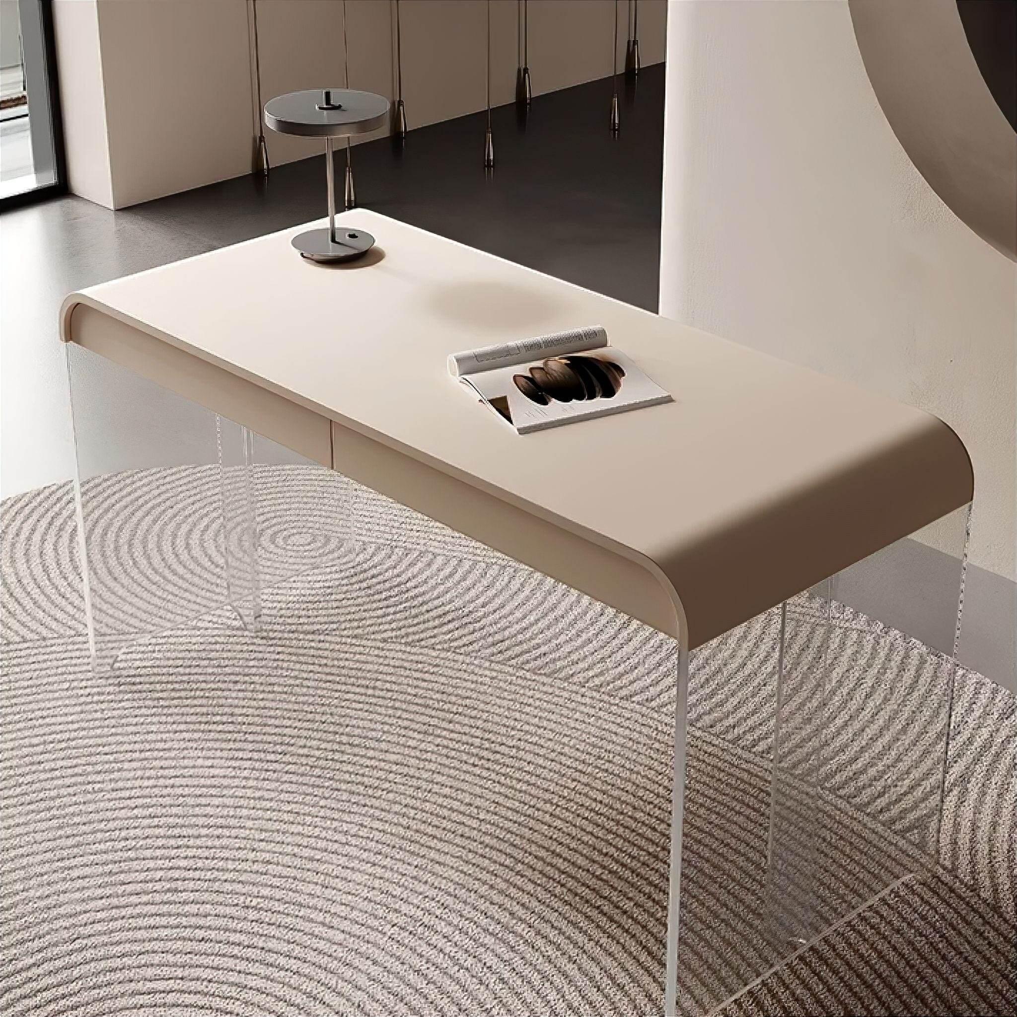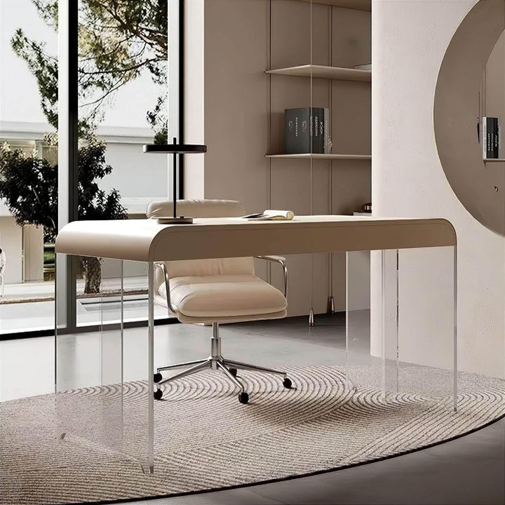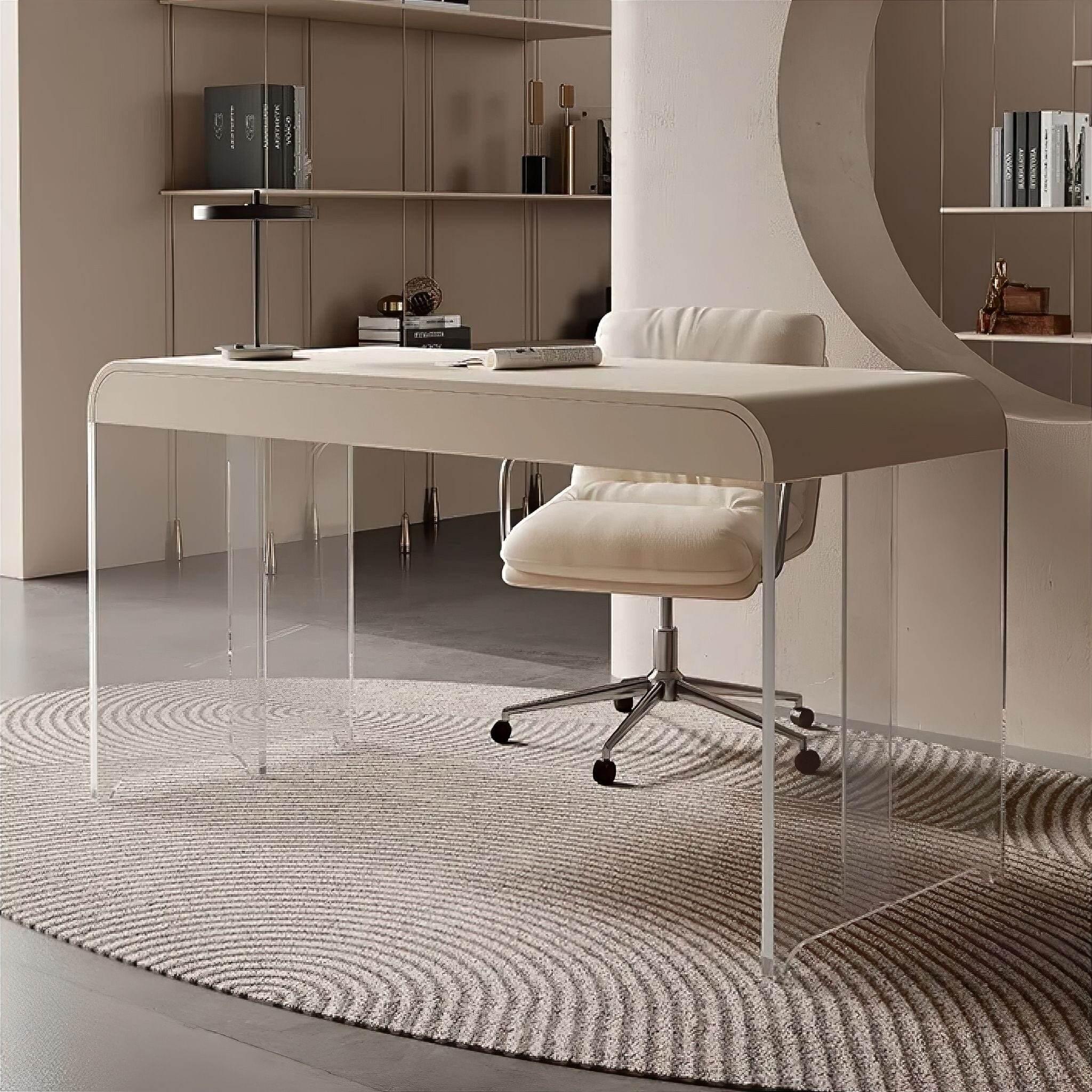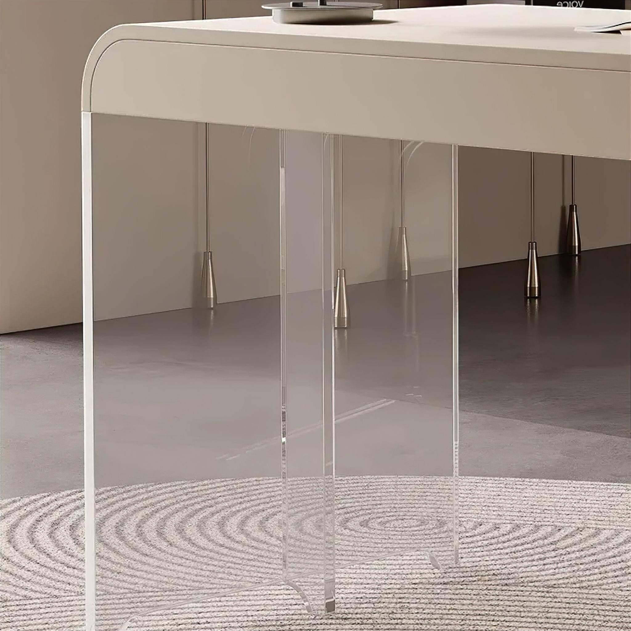 Der Martine Schreibtisch verbindet moderne Eleganz mit praktischer Funktionalität. Seine schlanken Acrylbeine bilden ein optisch leichtes und dennoch stabiles Fundament, während die hochwertige Einbrennlackierung der Holzarbeitsplatte Ihrem Arbeitsplatz einen Hauch von Raffinesse verleiht.