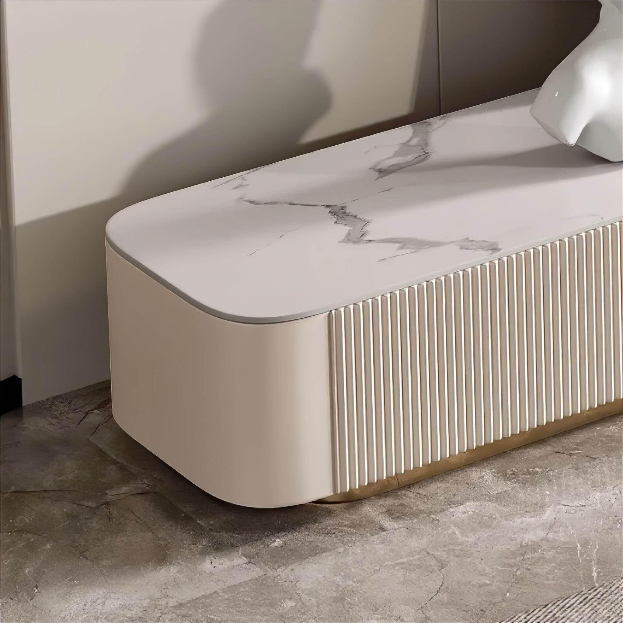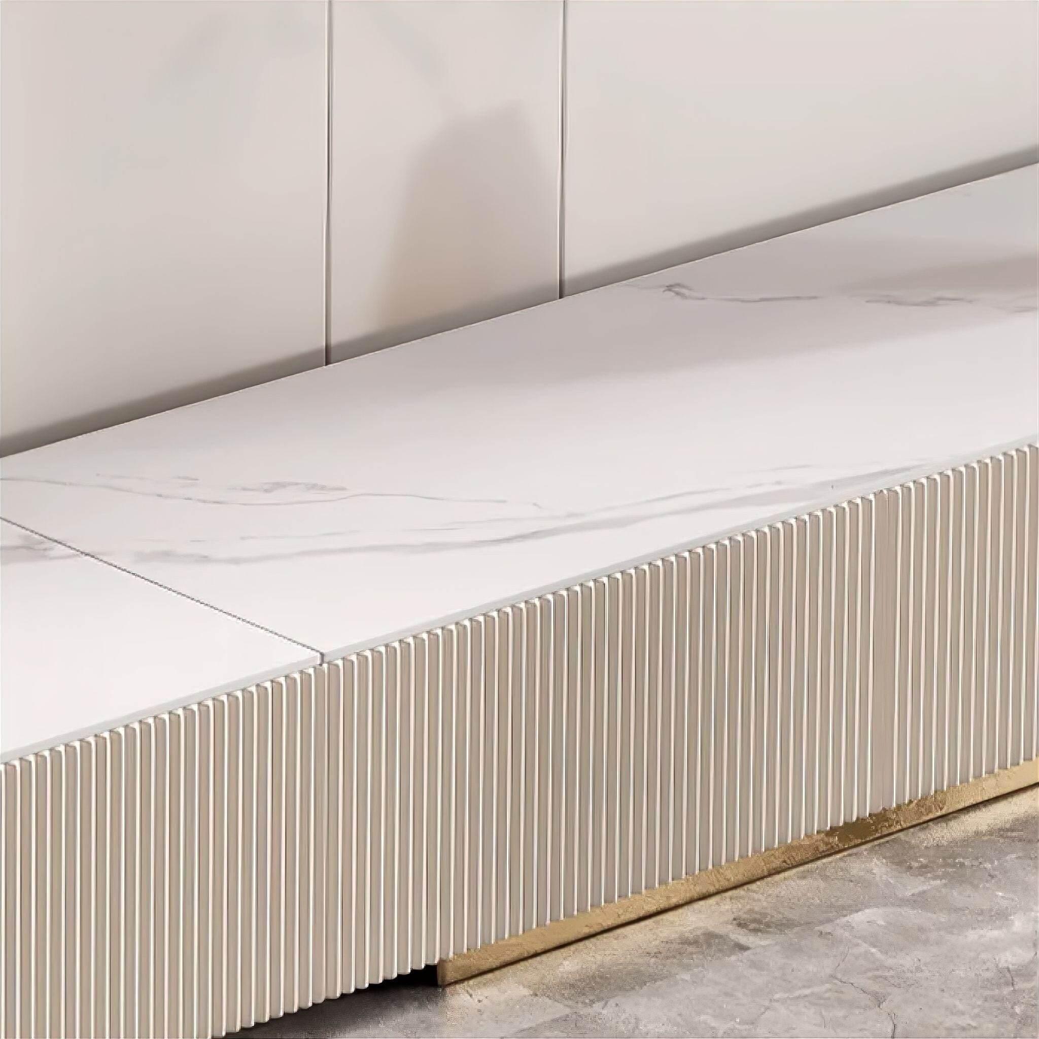 Das herausragende Merkmal dieses Schranks ist seine atemberaubende Arbeitsplatte aus Schieferstein, die nicht nur einen Hauch von Opulenz verleiht, sondern auch einen auffälligen Kontrast zum glatten Holz bildet und so die Gesamtästhetik Ihres Wohnraums aufwertet.