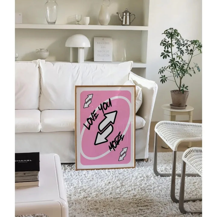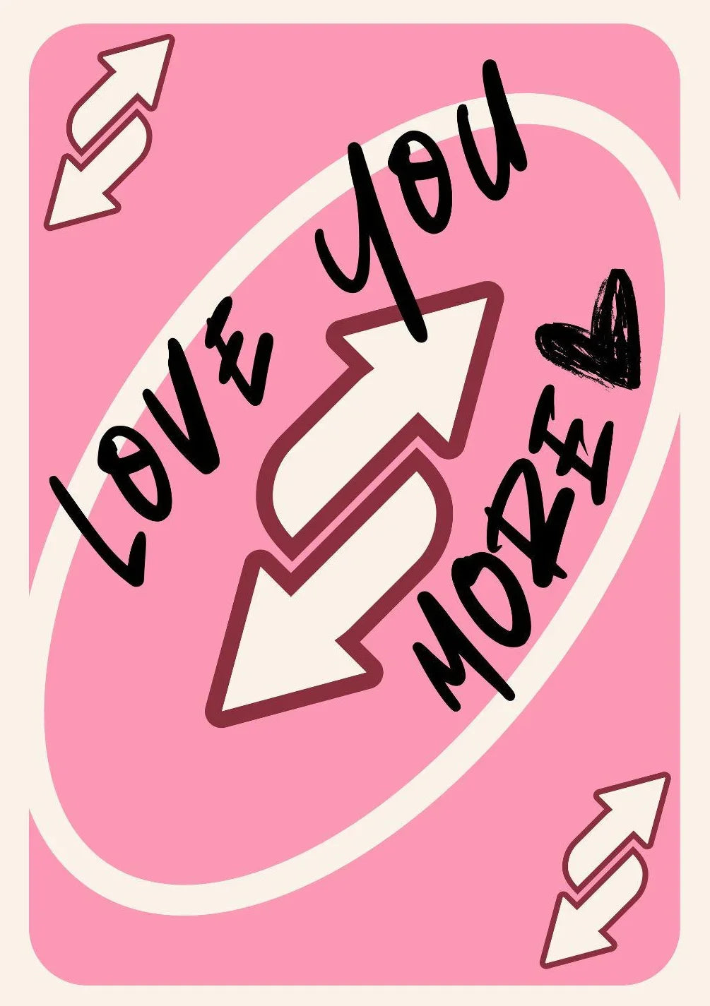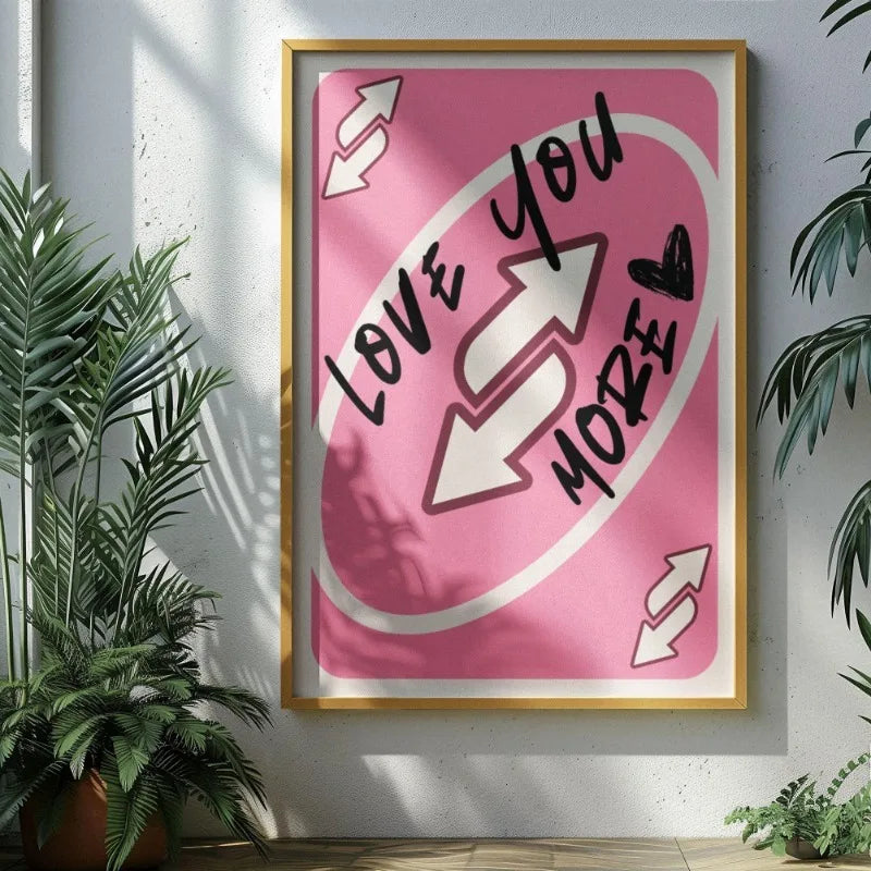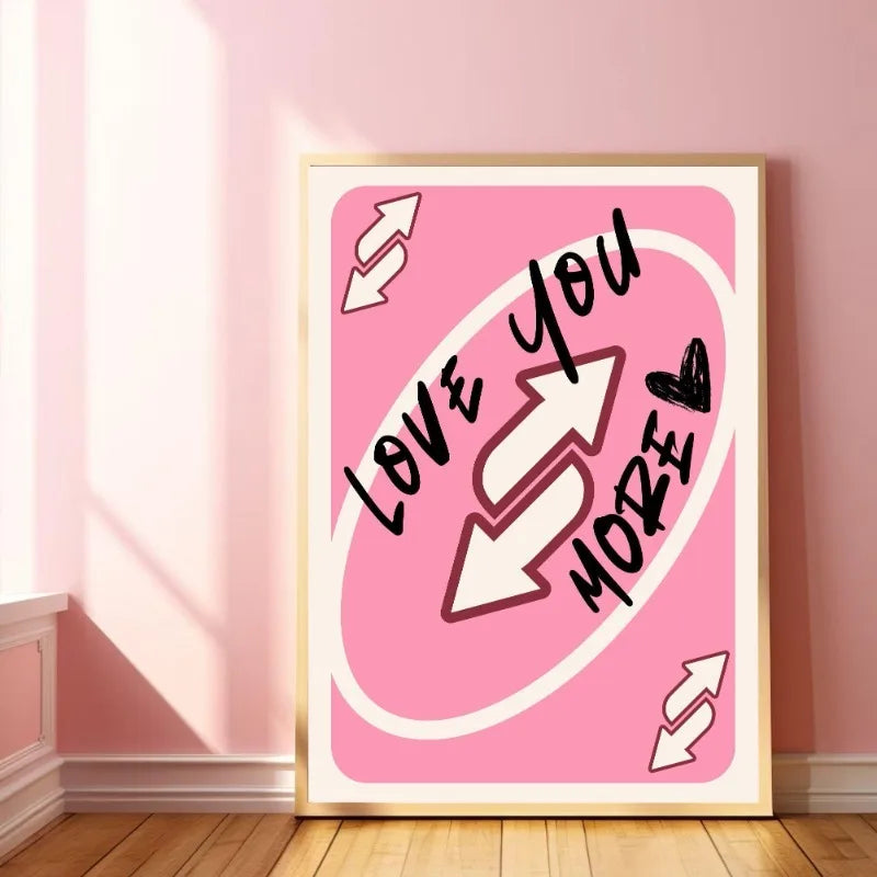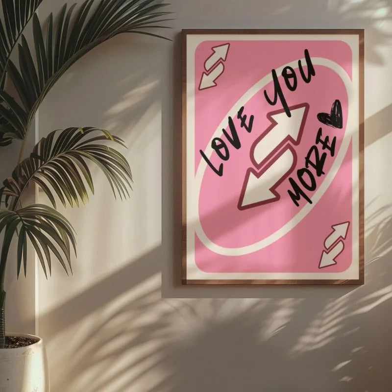 - Design: The poster showcases the iconic "Love You More" Uno Reverse card, blending fun, vibrant pink tones with a unique twist on the classic retro card game design.