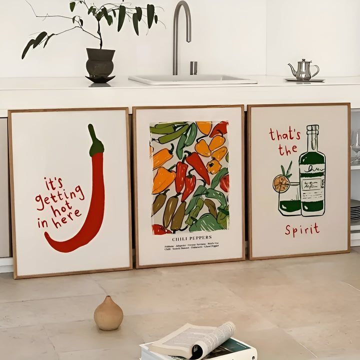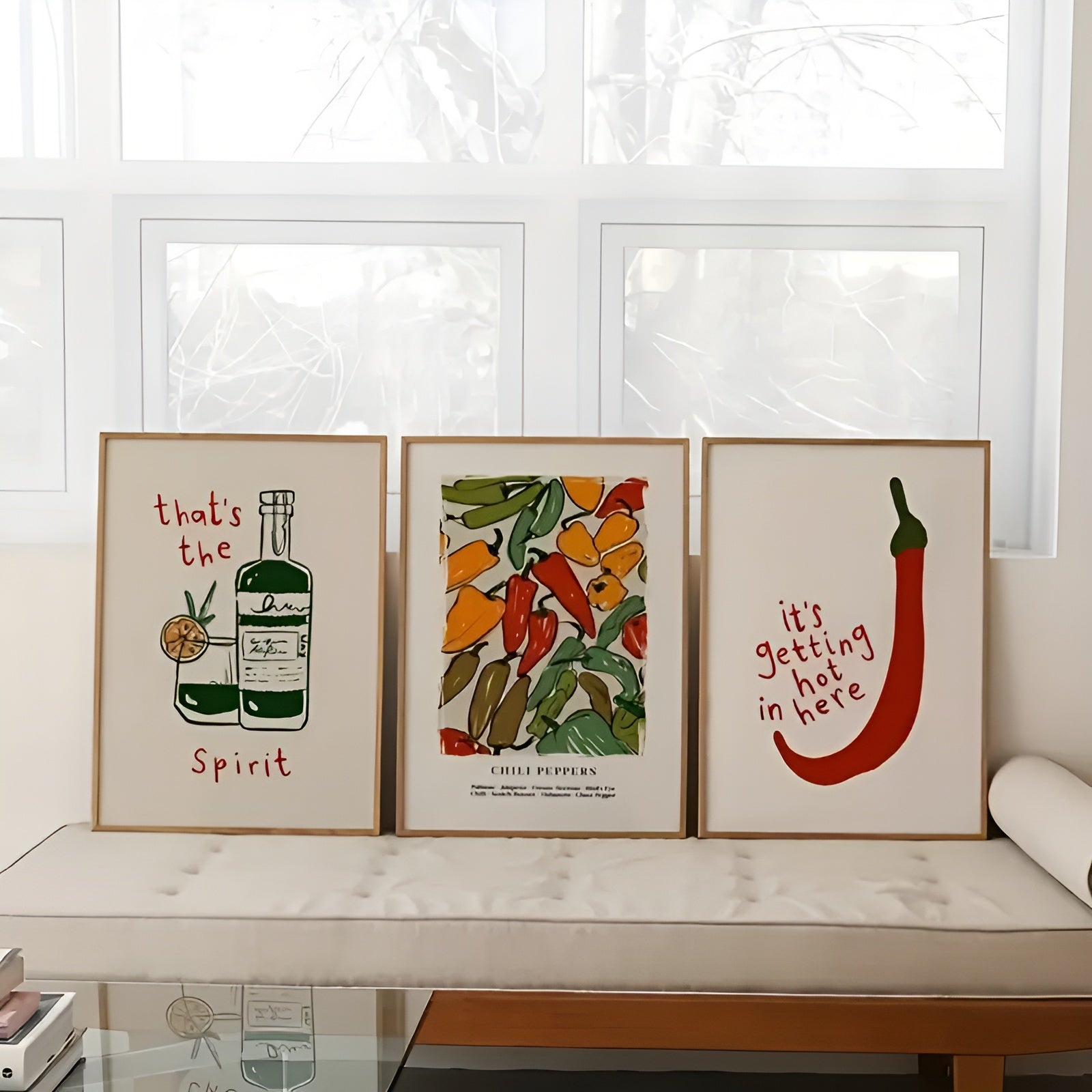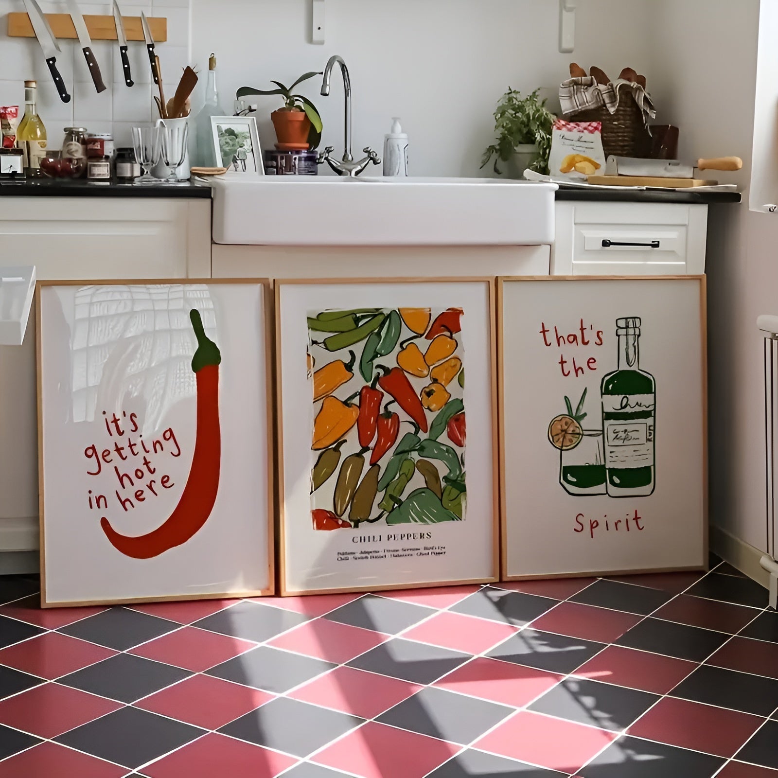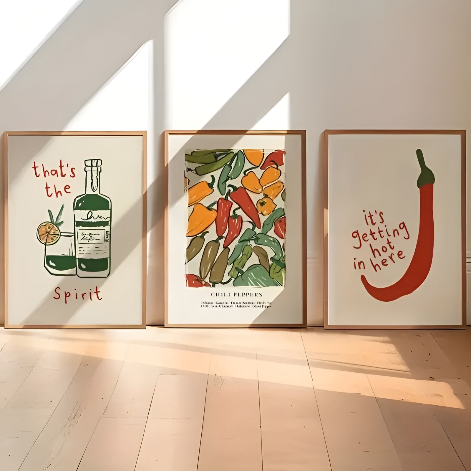 Spice up your kitchen or dining area with this Set of 3 Retro Chili Pepper Aesthetic Wall Art Prints. Featuring vibrant chili pepper designs in a retro-inspired style, these prints bring color, fun, and personality to any space. Perfect for kitchens, cafes, or dining rooms looking for a playful yet stylish touch.