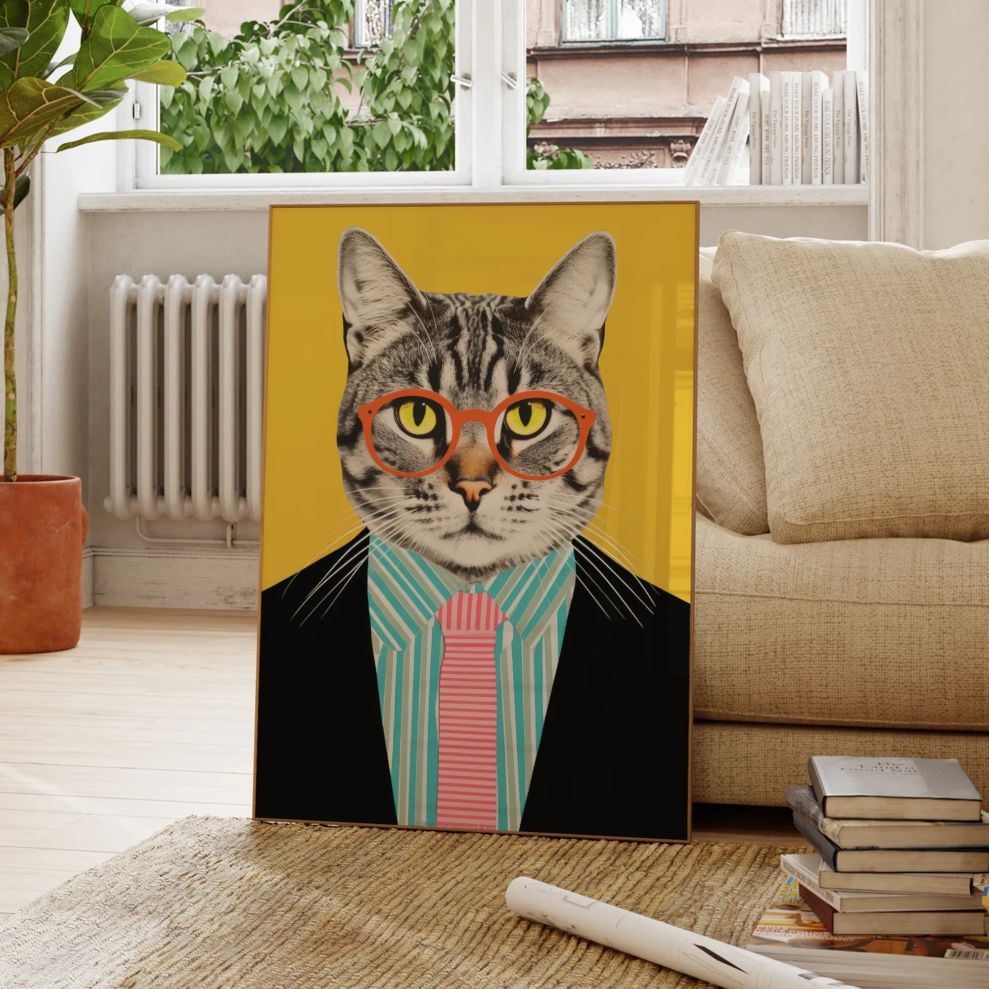 - Design : Met en scène un chat humoristique vêtu d'un costume jaune, portant des lunettes et dansant — une pièce maîtresse audacieuse et pleine de caractère pour n'importe quel espace.