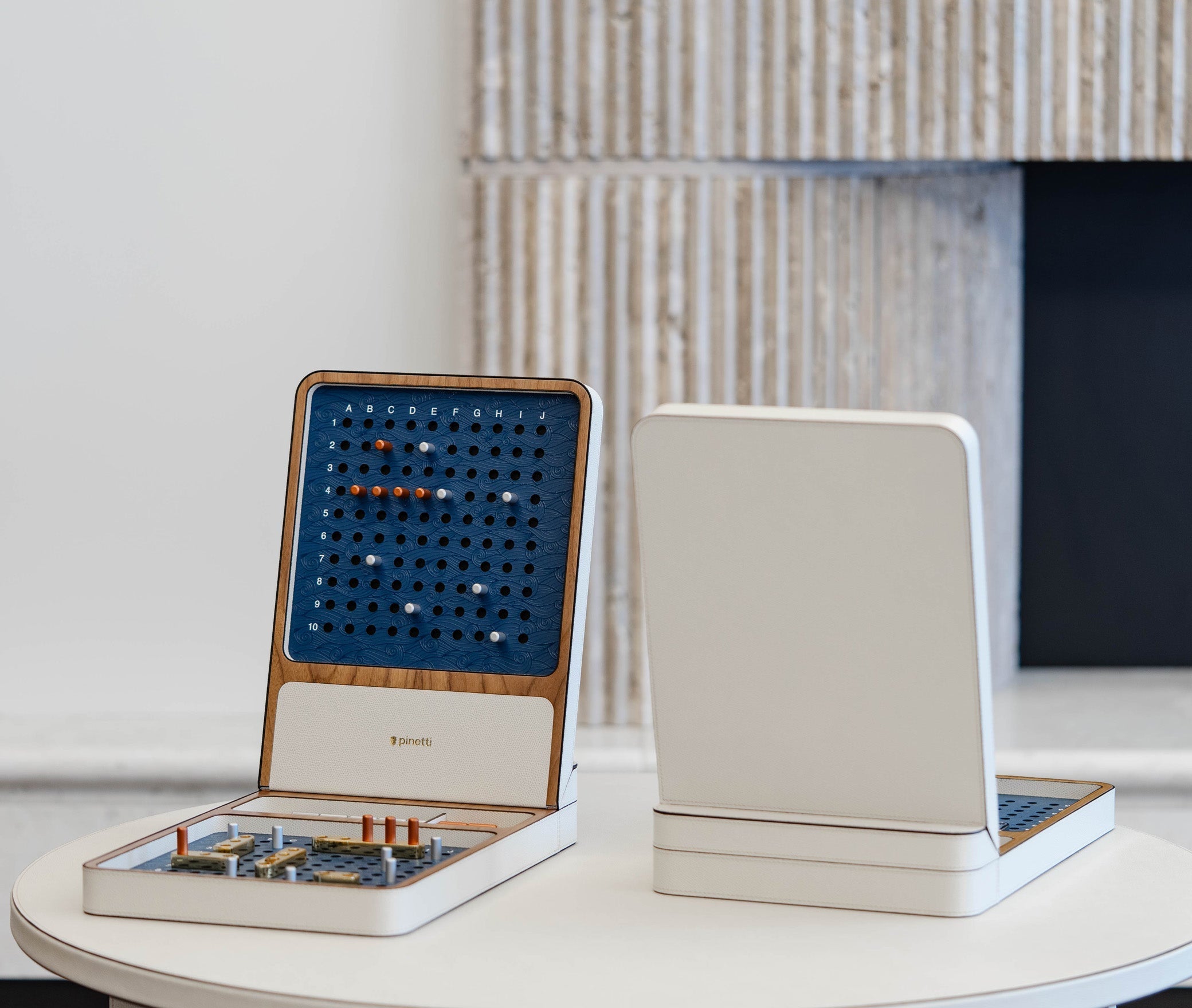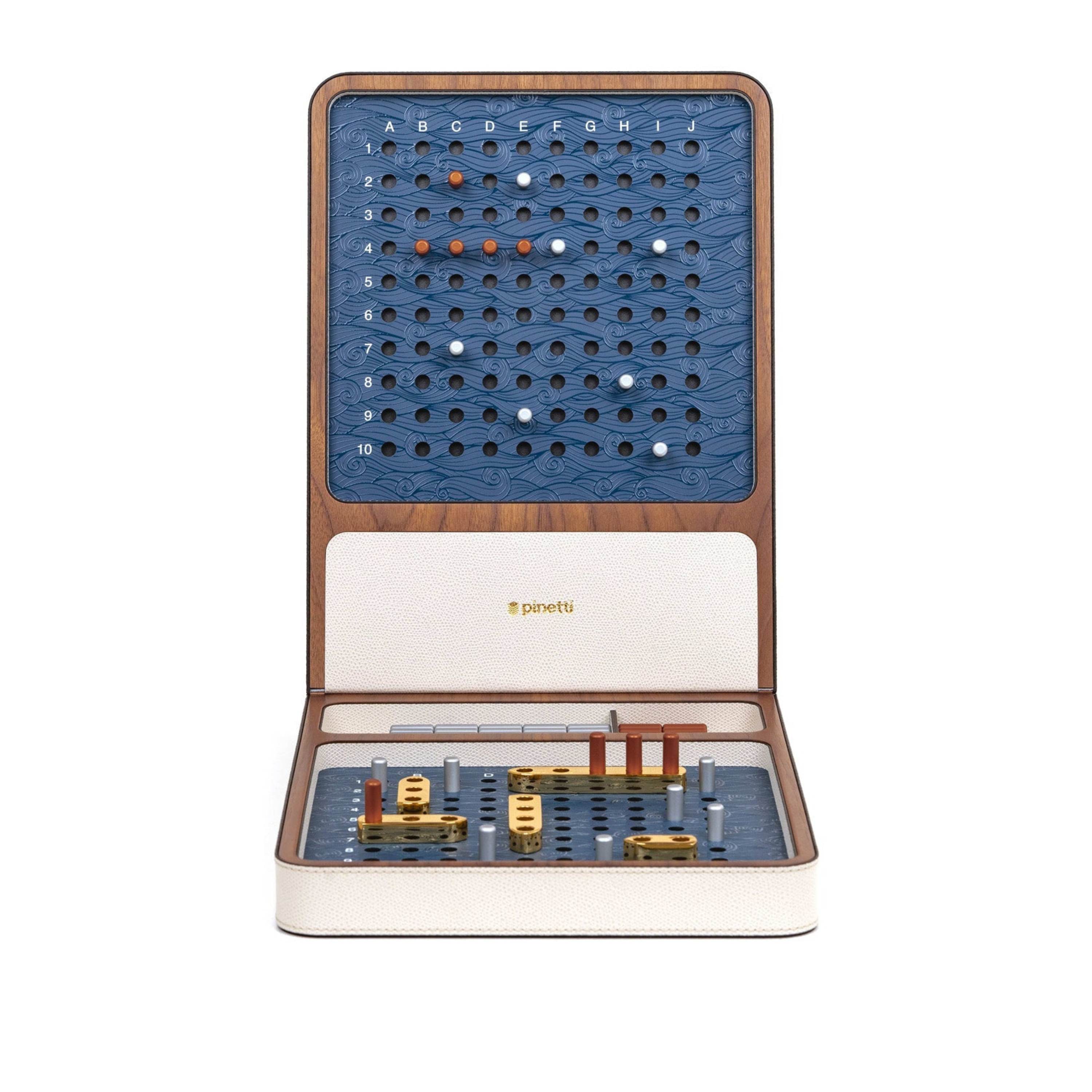 The new Battleship game set by Pinetti is a refined blend of tradition and modernity. It features two walnut wood boxes with a magnetic lid, covered in calf leather, and ten ships made of shiny brass with metal pegs in two colors. The embossed waves on the game board, created through digital printing, are a true masterpiece.