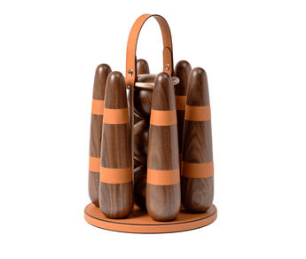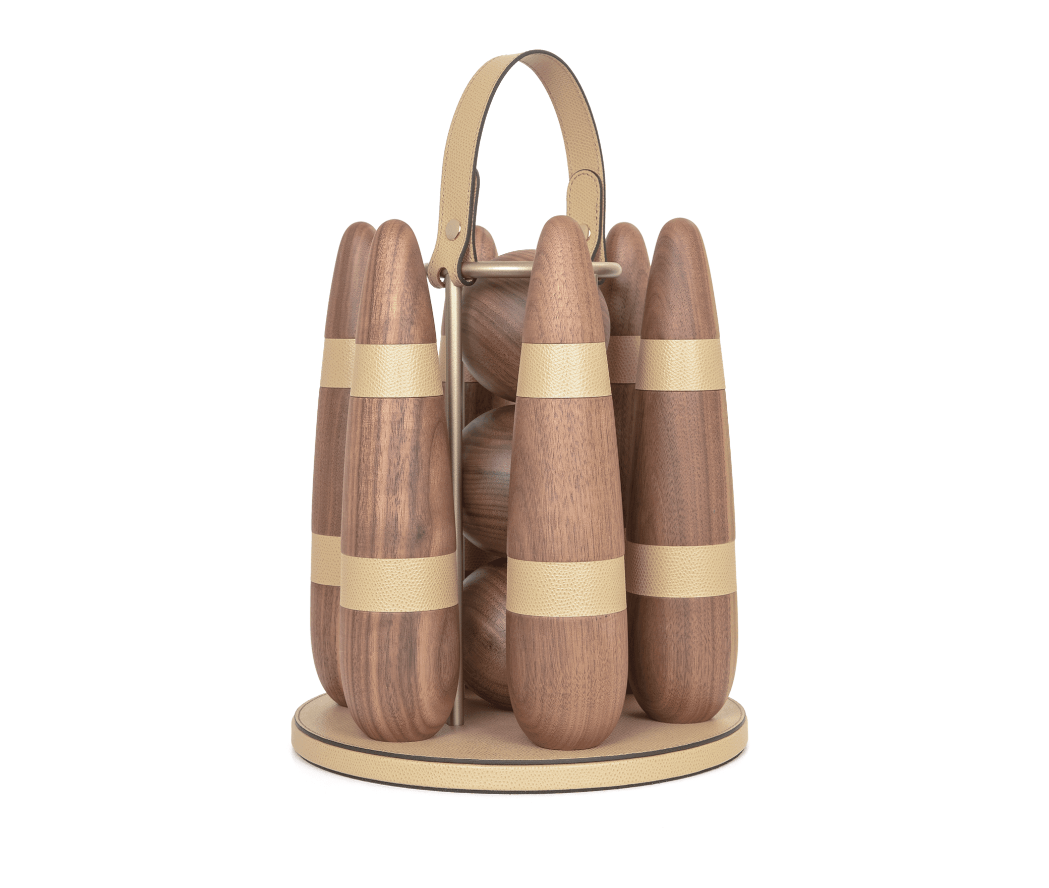 Experience the blend of luxury and playfulness with our masterfully handcrafted portable bowling set. Made from exquisite Canaletto walnut wood, this set is enriched with elegant leather details and a satin brass finish, making it a sophisticated gift for any age or an ultimate statement piece for your home or office. This indoor version includes three balls and six contemporary pins, offering endless enjoyment. It’s not hard to fall in love with this unique combination of craftsmanship and fun.