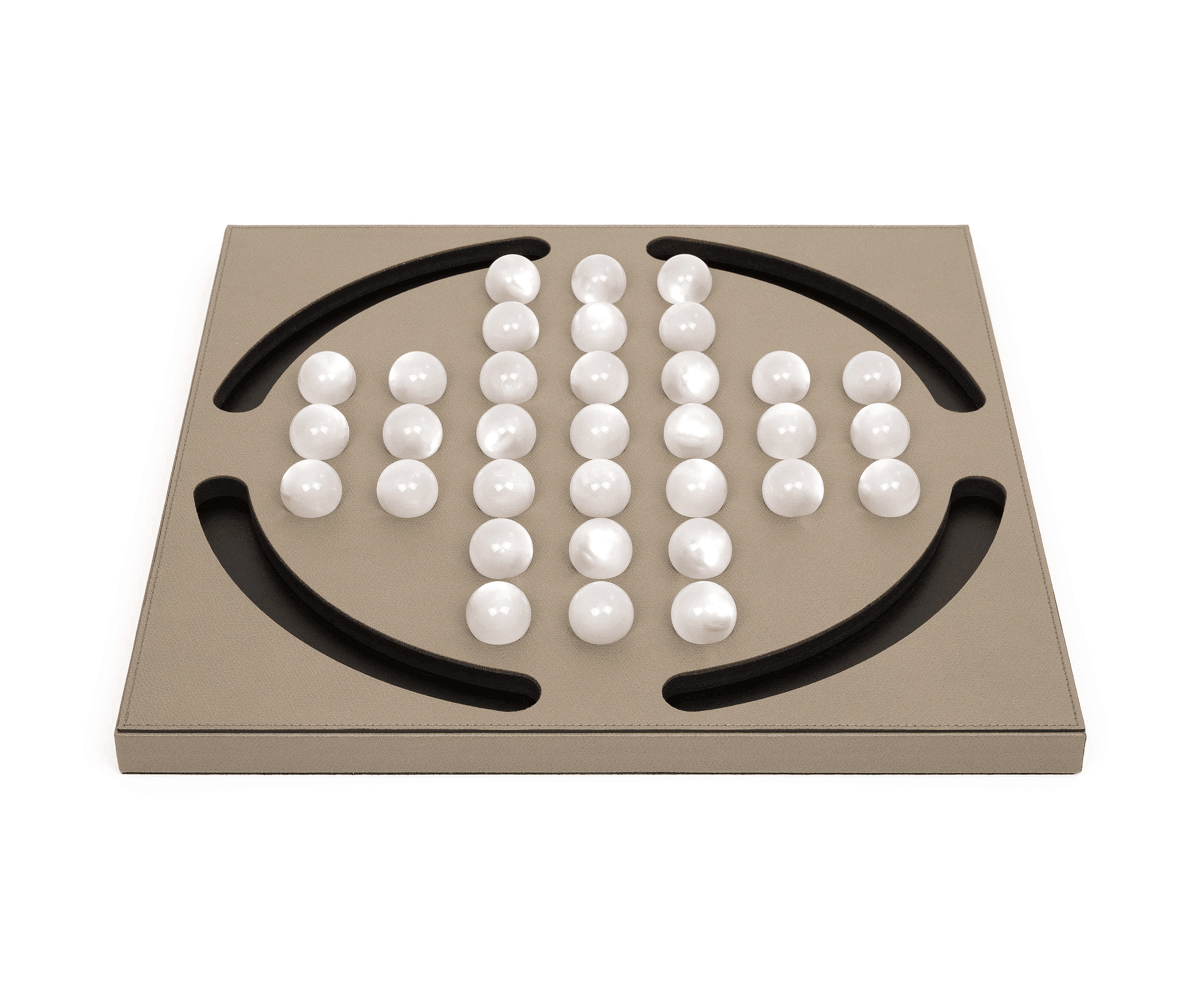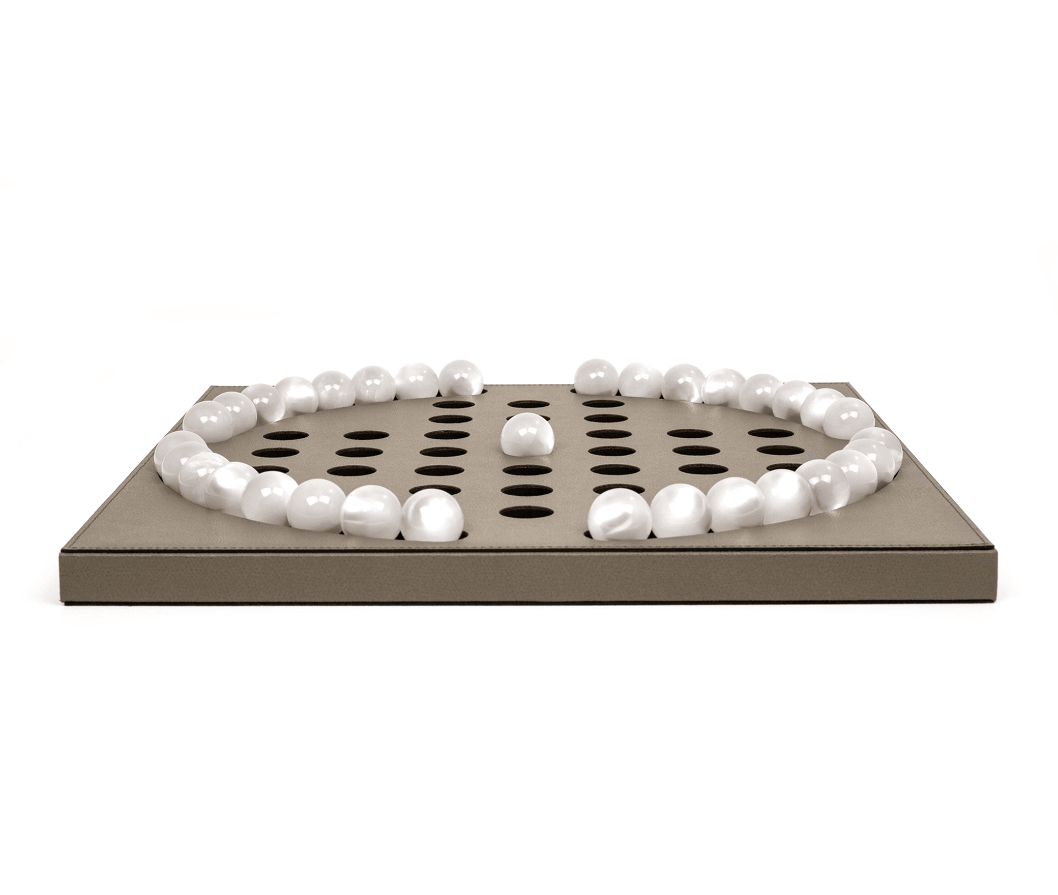 Our luxury collection has just been refreshed with an eye-catching new piece—Pinetti Solitaire. This stunning game set was exactly what was missing from your collection. Thirty-five eco-shell pawns with pearl accents beautifully decorate a soft leather board, combining elegance and entertainment. Enjoy your spare moments with this exquisite addition, perfect for elevating your game time.