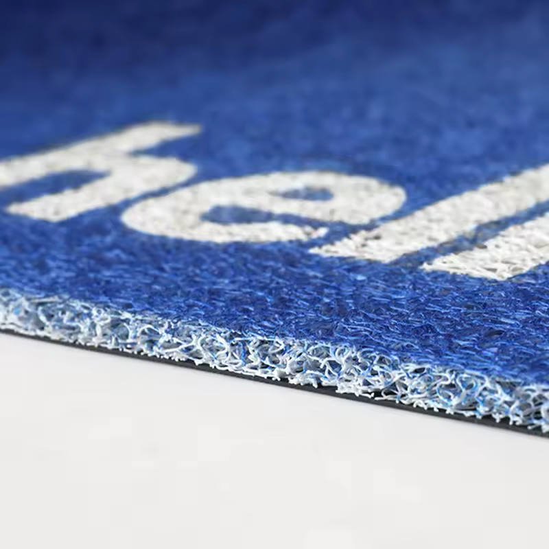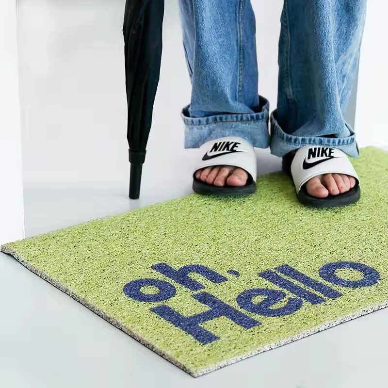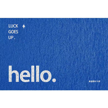 This modern PVC Anti-Slip Silk Loop Mat features a unique and modern creative design, including the welcoming message "hello." and the inspiring phrase "LUCK GOES UP." with an upward arrow. Available in vibrant colors such as Blue and Lime Green, this mat is the perfect solution for keeping your home clean and safe, and is ideal for various areas.