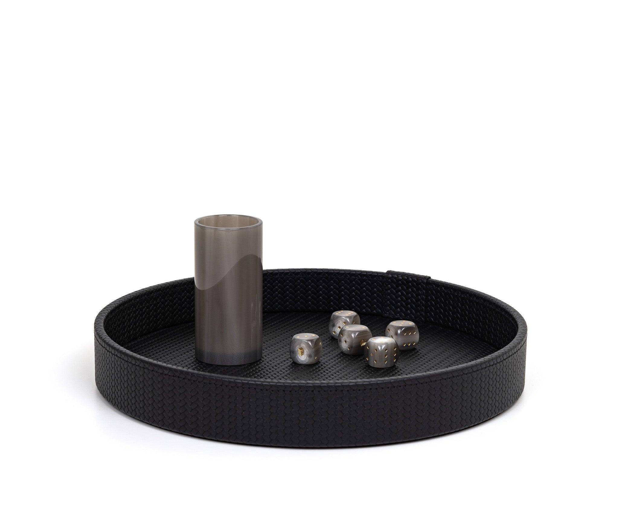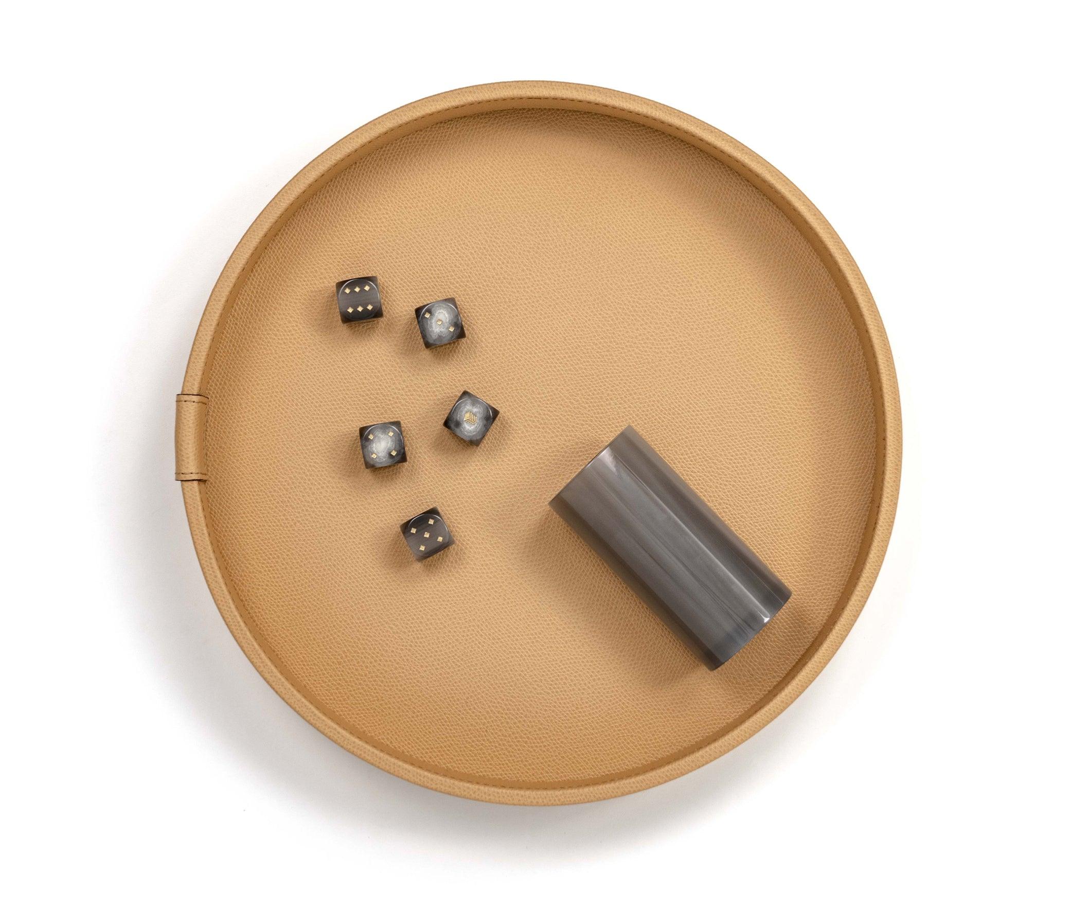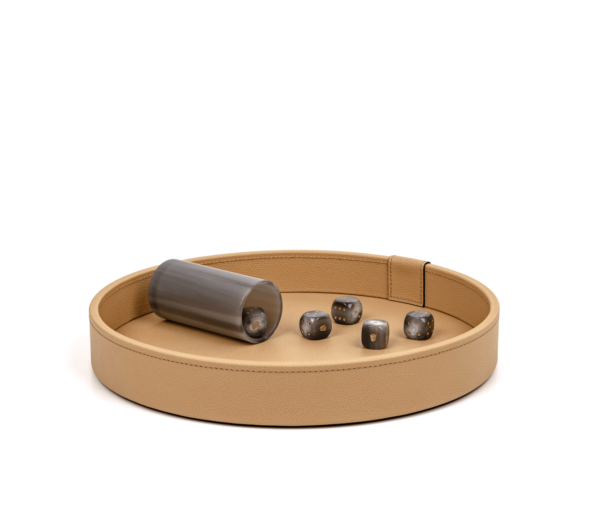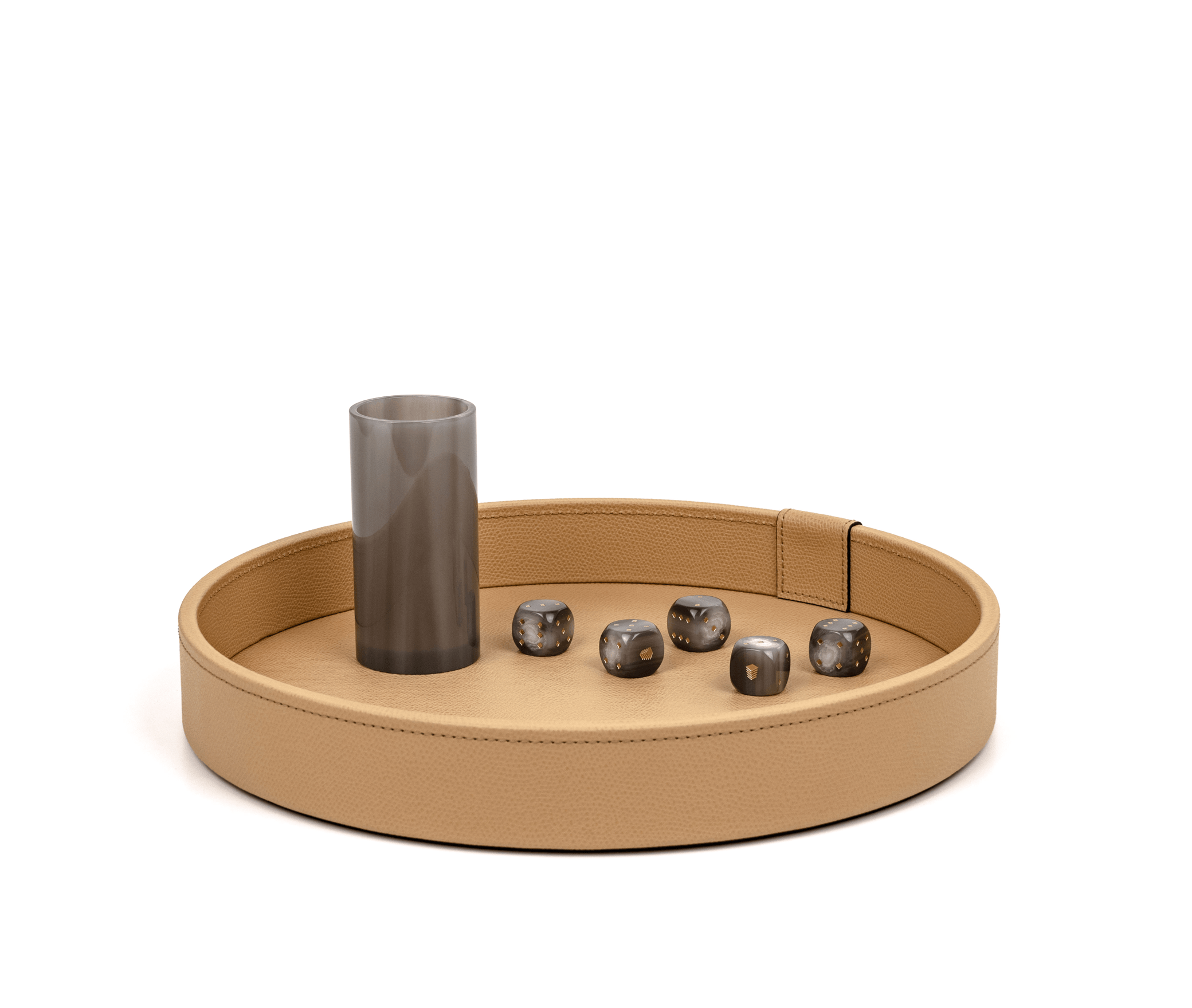 Elevate your game nights with our Gea round tray, crafted from waterproof and scratch-resistant calfskin leather, featuring a non-slip base. This essential design is a refined update on a classic, paired with a custom dice game set. The set includes one shaker and five Pinetti-customized resin dice. Available in a variety of leathers and colors, this piece seamlessly integrates luxury with leisure.